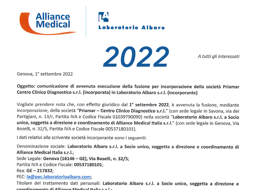 Priamar Centro Clinico Diagnostico nel settembre 2022 è stato fuso in Laboratorio Albaro srl che, riconoscendone la sua storica professionalità e qualità nell'offerta dei servizi ne ha fatto una sua nuova sede distaccata e punto di riferimento per coprire il territorio savonese.